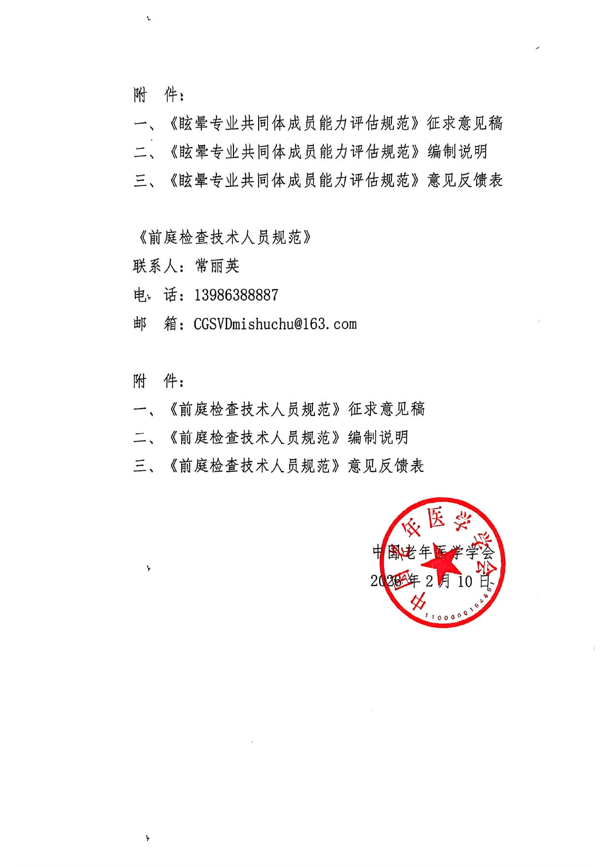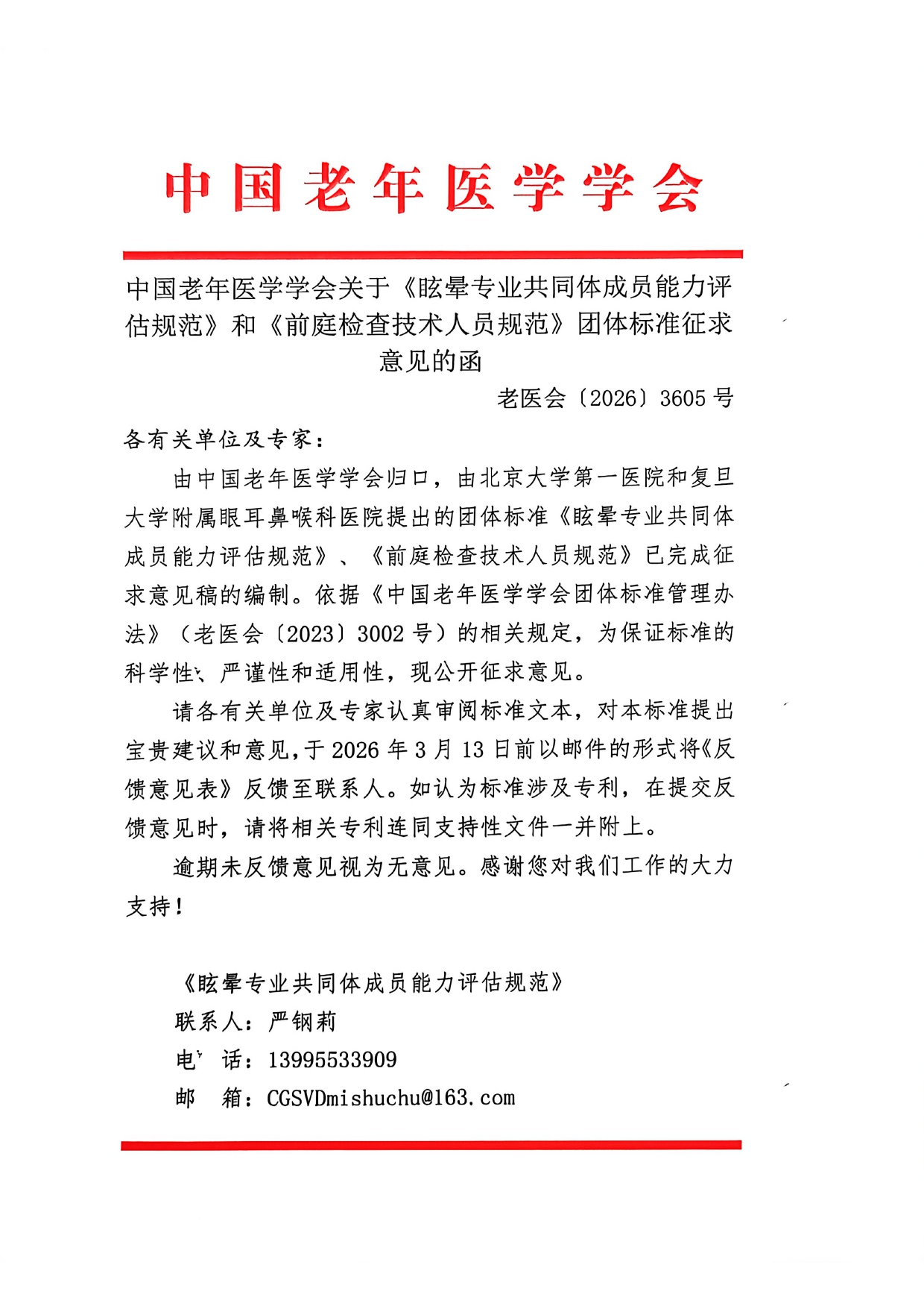 中国老年医学学会关于《前庭检查技术人员规范》团体标准征求意见的函
